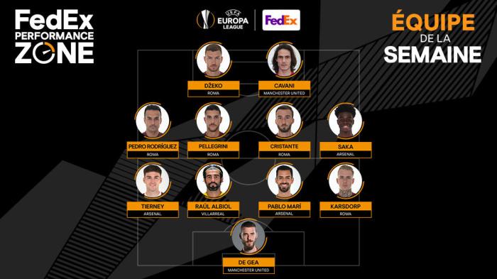 JRS直播网讯 欧联杯半决赛结束,曼联淘汰罗马,与淘汰了阿森纳的比利亚雷亚尔会师决赛。今日,欧足联官方公布了本周欧联杯最佳阵容。