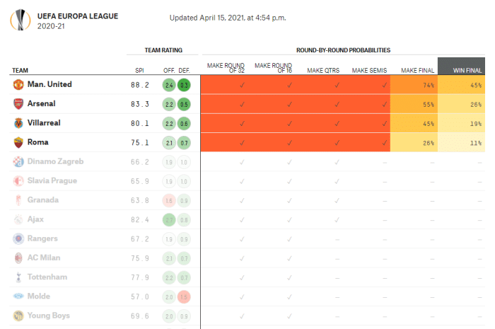 JRS直播网4月16日讯 欧联杯四强出炉了,曼联、罗马、比利亚雷亚尔和阿森纳进入了欧联杯四强,而其中曼联将要对阵罗马,比利亚雷亚尔要对阵阿森纳,首回合的比赛在当地时间4月29日举行,次回合的比赛在当地时间5月6日举行(北京时间都要晚一天)。而其中,曼联和比利亚雷亚尔都是先主后客。而大数据网站“538”也更新了本赛季欧联杯夺冠的几率,其中曼联是最大的热门。