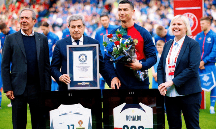C罗获赠17号和200号球衣以及吉尼斯世界纪录认证,第200次国家队出场,足坛第一;