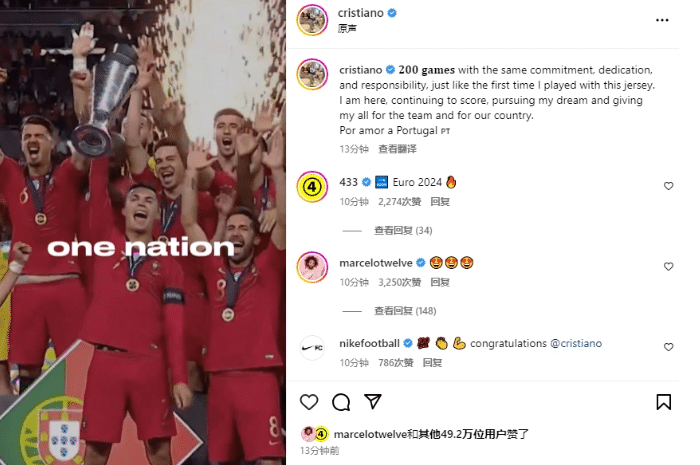 比赛结束之后,C罗霸气发声,他也兑现了自己放出的豪言,自己依旧是国家队不可或缺的一员。C罗也表示:“200场,如同我第一次身披国家队球衣出战时带着相同的承诺、奉献以及责任感。我就在这里,继续进球,继续追梦,为球队和我们的国家奉献一切。为了葡萄牙之爱。”