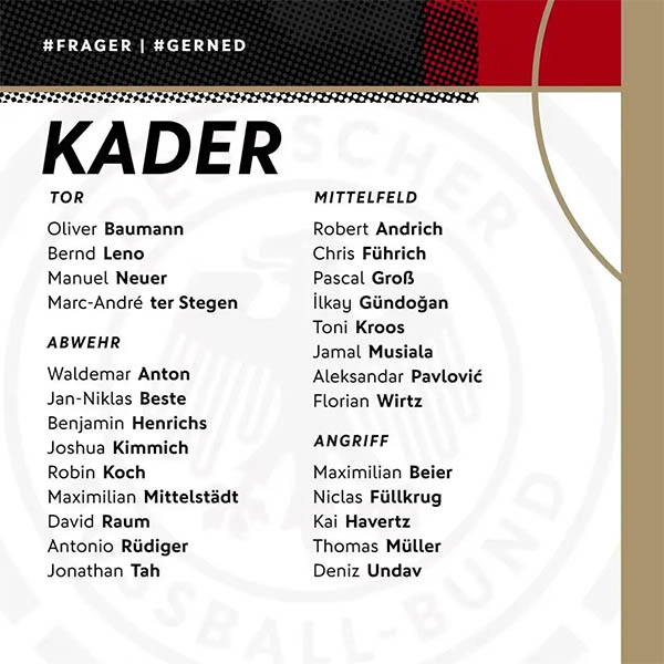 JRS直播网讯 德国男足公布新一期球员名单,其中34岁的克罗斯正式回归,哈弗茨、基米希在列,小将帕夫洛维奇入选。此次多特蒙德仅菲尔克鲁格1人入选,胡梅尔斯、罗伊斯等未在列。