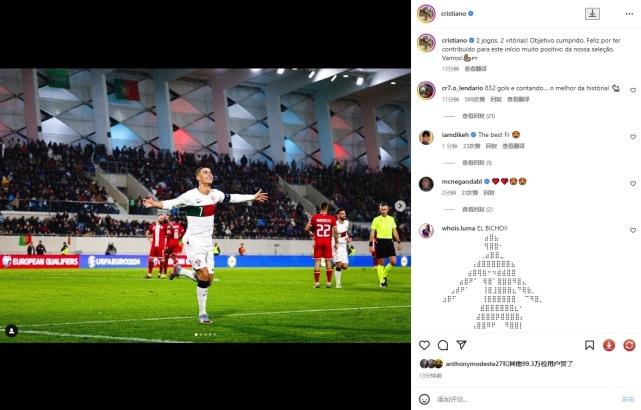 C罗晒出了自己本场比赛进球瞬间和进球后的庆祝动作,还有与队友们拥抱庆祝的组图,并且附文写道:“2场比赛,2场胜利!目标已经达成,很高兴能为国家队这个非常积极的开端做出贡献,加油!”而评论区,C罗粉丝也纷纷刷屏写道:“GOAT!”;“VIVA Ronaldo!”