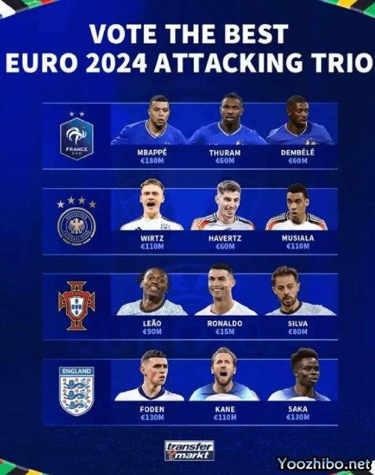JRS直播网讯 德国欧洲杯将在今夏举行,《转会市场》也列出了四大强国的前场三叉戟组合,并提问“哪个组合最强?”