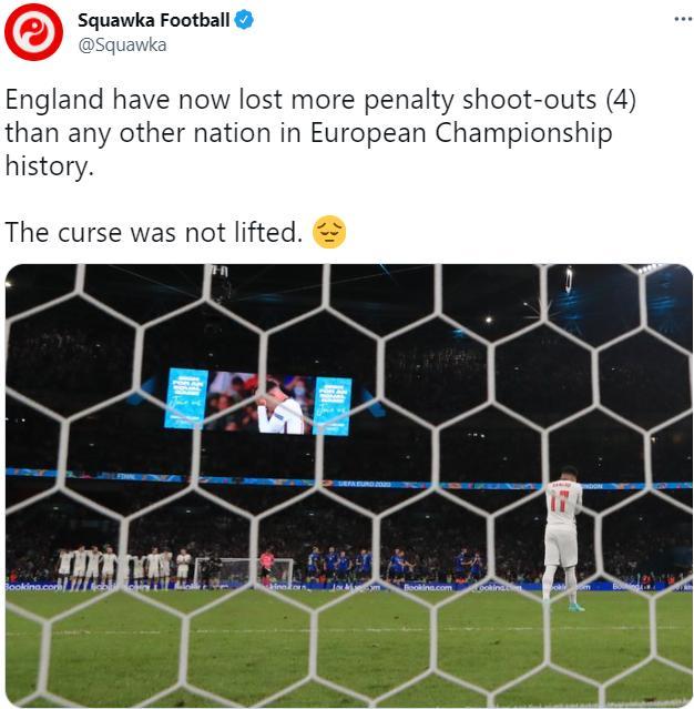 JRS直播网讯 据Squawka统计,英格兰在欧洲杯中已经4次倒在点球大战,是所有国家队里最多的。