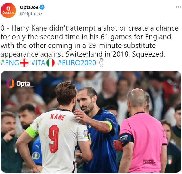 JRS直播网讯 据OPTA数据统计,英格兰队长凯恩在今天的欧洲杯决赛中120分钟0射门并创造0次机会。