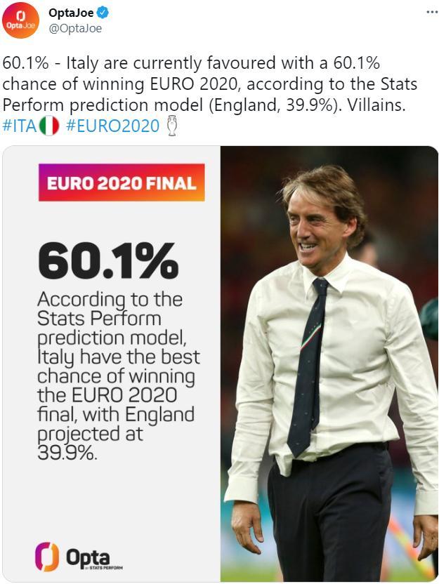 JRS直播网讯 OPTA近日用数据模型对欧洲杯决赛作出预测,意大利夺冠概率为60.1%。