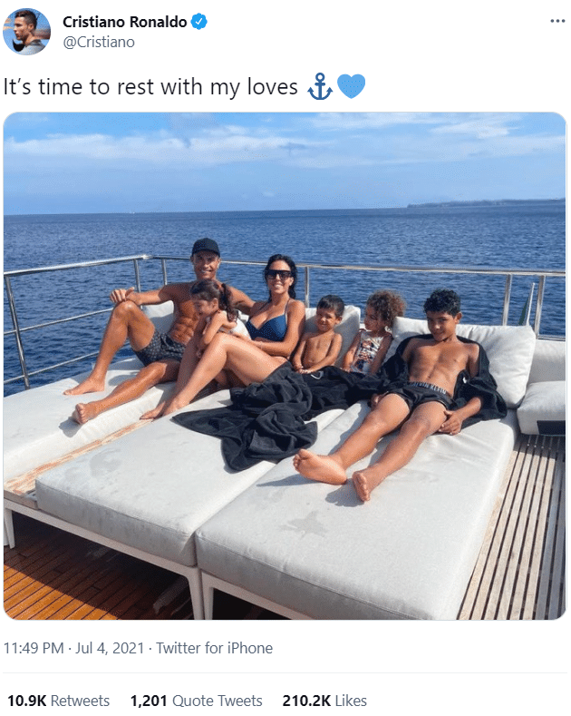 C罗晒度假照: 是时候和我爱的人一起休息了