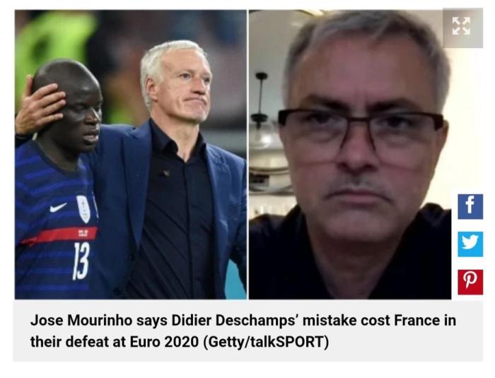 JRS直播网讯 今天凌晨结束的欧洲杯1/8决赛中,法国队爆冷失利。赛后,穆里尼奥在接受TalkSport采访时谈到了德尚87分钟换下格列兹曼的举措,穆帅表示这次换人是德尚犯下的一个错误。