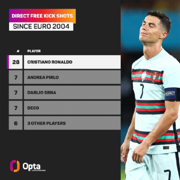 C罗本届欧洲杯4场比赛过人10次,队内第一,在所有球员中排名第14。此外,他8次射正也是赛事第一。