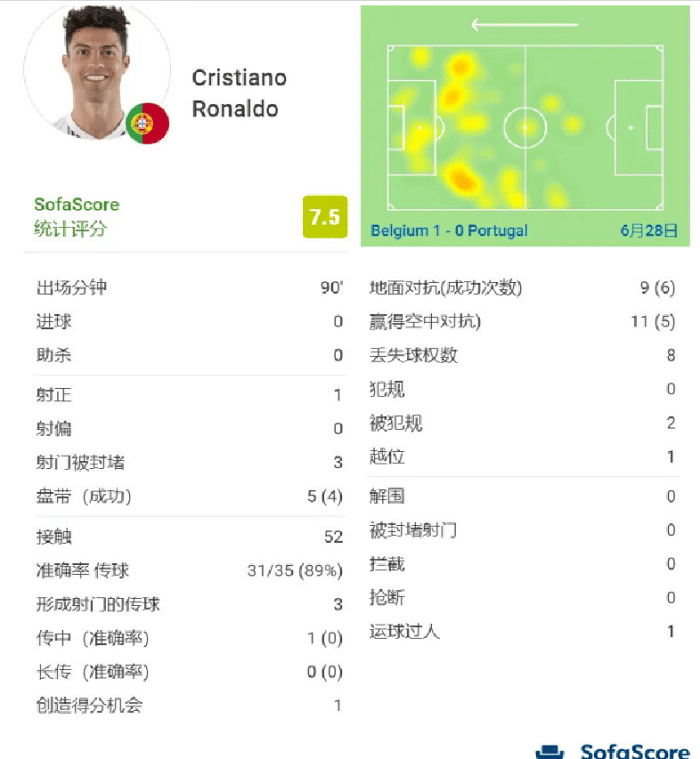 若塔和B费表现不佳,只是大部分球员的缩影,葡萄牙国家队依靠谁?本场比赛桑谢斯表现不错,他可以说是球队中场的大腿,不过球队前场的大腿、球队的核心还是36岁的C罗。本场比赛C罗可以说非常努力了,36岁的他踢满全场,4次射门全场最高,其中1次射正,3次被对方封堵。其他数据方面,C罗35次传球31次成功,同时贡献3次关键传球全场最多,5次过人4次成功全场最多,9次地面对抗赢得6次,11次空中对抗赢得5次,一共11次对抗也是全场最多的。