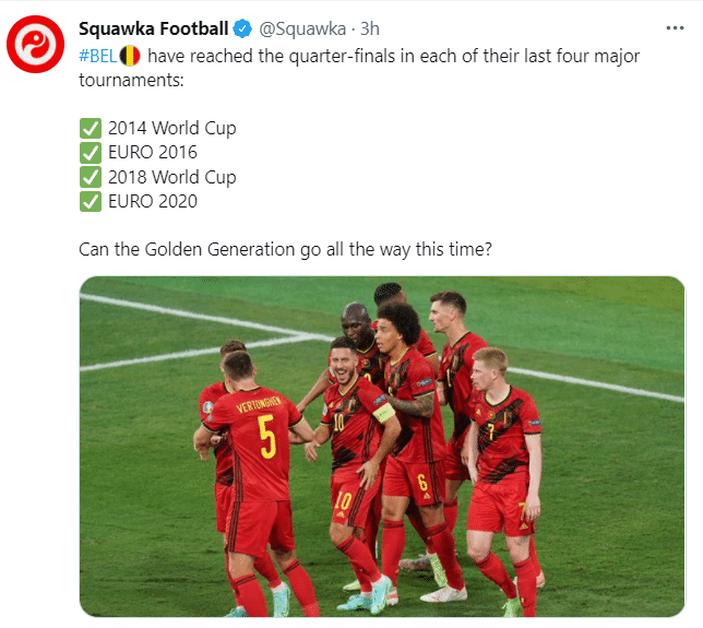 JRS直播网讯 根据Squawka统计,比利时队史第四次杀入欧洲杯8强,同时欧洲红魔已经连续4届大赛进入8强。
