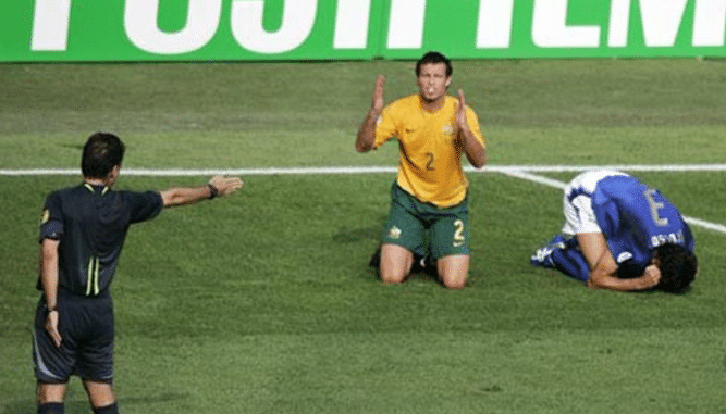 “点球!点球!点球!格罗索立功啦!格罗索立功啦!不要给澳大利亚人任何的机会!伟大的意大利的左后卫,他继承了意大利的光荣的传统!法切蒂、卡布里尼、马尔蒂尼在这一刻灵魂附体!格罗索一个人,他代表了意大利足球悠久的历史的传统!在这一刻,他不是一个人在战斗!他不是一个人!”