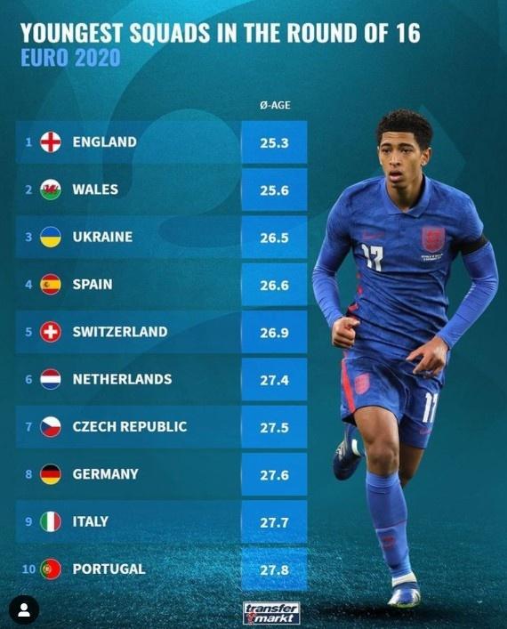 JRS直播网讯 昨晚,欧洲杯16强淘汰赛已经打响,此前德转市场统计了欧洲杯16强的平均年龄排行,英格兰队平均只有25.3岁是16支球队中最年轻的。