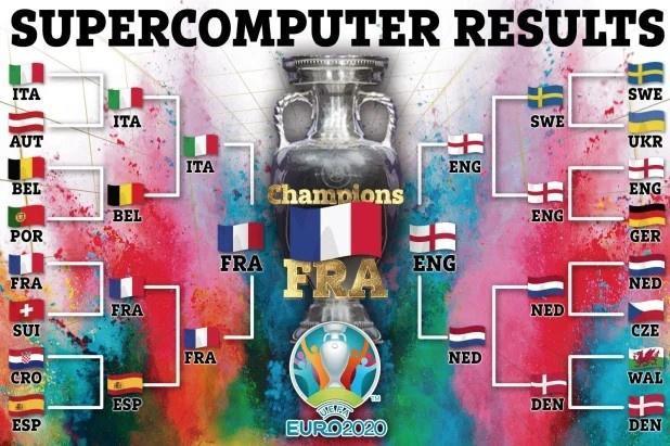 谁是四强?谁将夺冠?超算预测比利时将会击败葡萄牙,但之后输给意大利无缘四强;英格兰击败德国、瑞典、荷兰挺进决赛;意大利击败奥地利和比利时进入四强;荷兰击败捷克和丹麦进入半决赛后不敌英格兰;法国击败瑞士、西班牙之后,决赛击败英格兰,赢下本届欧洲杯。
