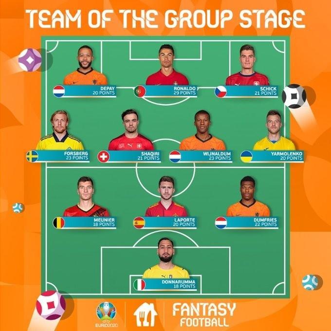 JRS直播网讯 欧足联今日公布了欧洲杯小组赛阶段的最佳阵容评选结果,C罗29分最高分领衔。
