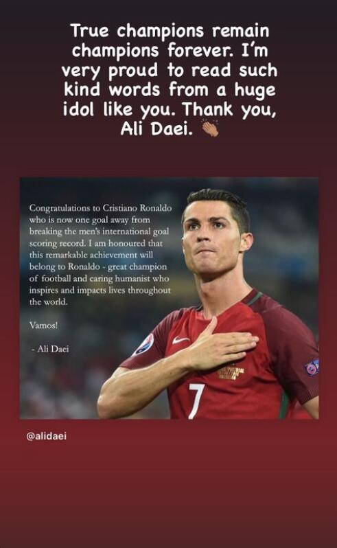 C罗随后在Instagram上作出回应,他写道:“真正的冠军永远都是冠军。收到像你这样的偶像的鼓励,我感到非常自豪,谢谢你,阿里-代伊。”