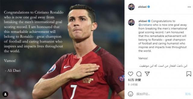JRS直播网讯 伊朗传奇球星阿里-代伊日前在Instagram上发文祝贺C罗,他表示这位葡萄牙巨星将影响全世界。