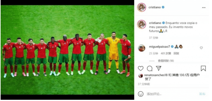 C罗本届欧洲杯已经打进3球,在对德国时传射建功。他晒出了葡萄牙全队的赛前合影:“当你复制我的过去,我已经创造了新的未来。”