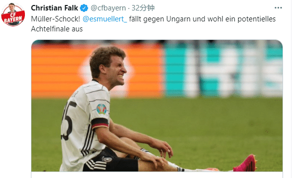 穆勒在击败葡萄牙的比赛中最后时刻右膝盖受伤,名记法尔克透露,他将无缘对匈牙利的比赛。如果德国晋级16强,他也可能无缘这场比赛。