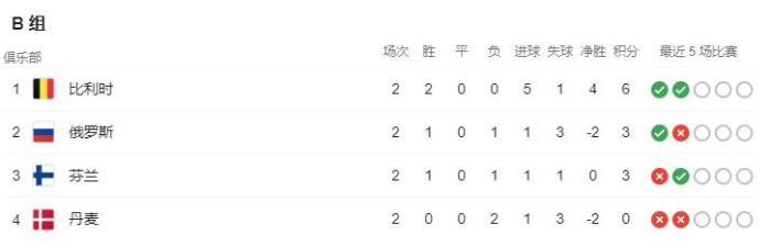B组方面,比利时2战2胜提前晋级,俄罗斯和芬兰积3分,丹麦0分垫底,但下轮若赢球仍有出线希望。打开UC浏览器 查看更多精彩图片