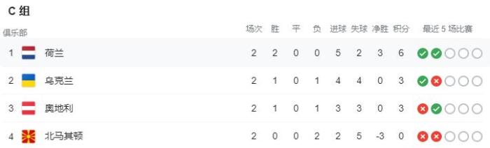 C组荷兰6分,凭借相互战绩锁定小组第一,乌克兰和奥地利3分分列二三,北马其顿0分,因互相战绩劣势已被淘汰,成为本届欧洲杯首支被淘汰的球队。