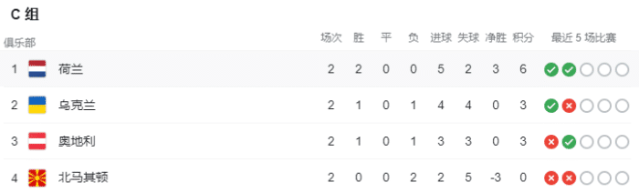 C组荷兰6分,凭借相互战绩锁定小组第一,乌克兰和奥地利3分分列二三,北马其顿0分,因互相战绩劣势已被淘汰,成为本届欧洲杯首支被淘汰的球队。
