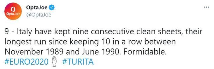 据知名数据网站Opta统计,意大利已经连续9场比赛保持零封,距离1989年11月-1990年6月创造的10场比赛不丢球纪录只差1场。