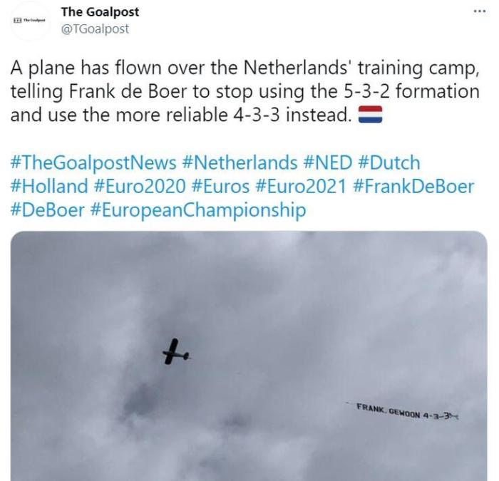 据报道,一些荷兰球迷对弗兰克-德波尔在热身赛上使用的5-3-2阵型感到不满,他们用飞机拉横幅要求德波尔变阵4-3-3。