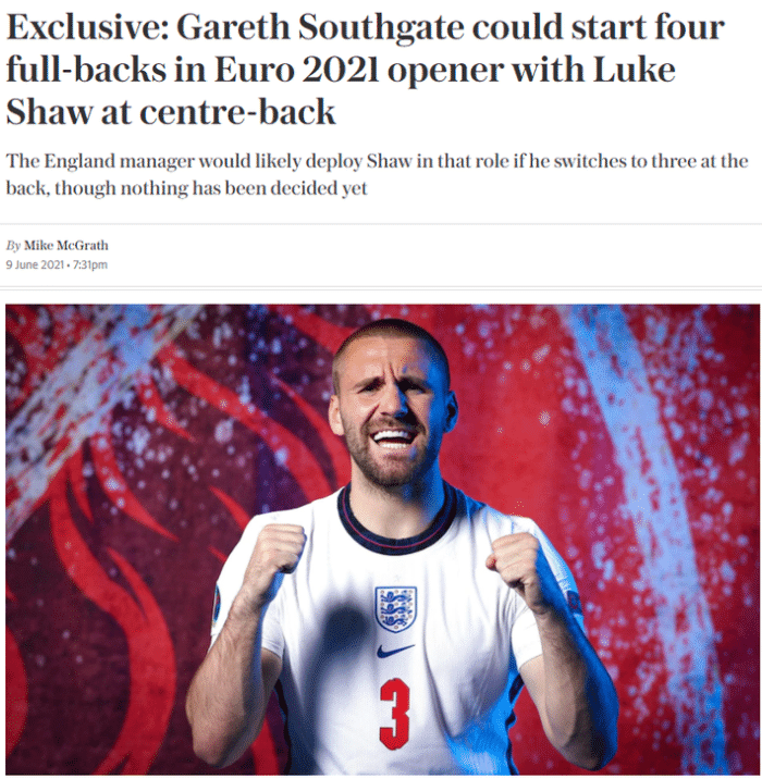 报道称,索斯盖特正在练习3-4-3和4后卫阵型,为马奎尔因伤缺阵寻找解决方案。如果在对阵克罗地亚的首场欧洲杯中使用三后卫阵型,那么索斯盖特可能会安排卢克-肖出任左中卫。