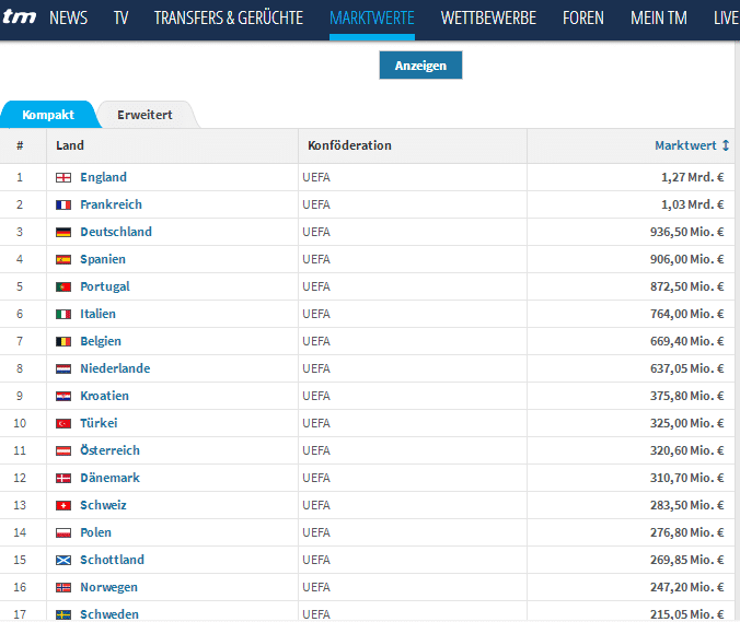 JRS直播网讯 欧洲杯的比赛即将开始了,许多球迷都开始关注欧洲杯的比赛了。那么,本届欧洲杯比赛中,各大球队的身价如何呢?今天小编就查了一下德转给出的身价,其中参加欧洲杯的球队中,英格兰国家队的身价最高,高达12.7亿欧元,而排名第二的法国国家队则只有10.3亿欧元,第三的是德国队,他们的身价只有9.365亿欧元,好了话不多说一起看排名。