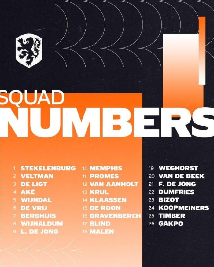 JRS直播网讯今日,荷兰欧洲杯名单号码版出炉,德容21号,德佩10号,维纳尔杜姆8号,德里赫特3号。