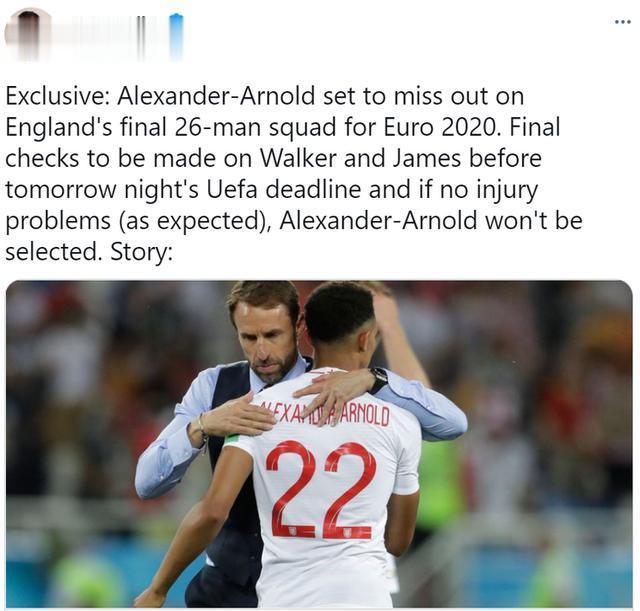 JRS直播网讯据ESPN记者詹姆斯-奥利报道,阿诺德将无缘英格兰的欧洲杯大名单。
