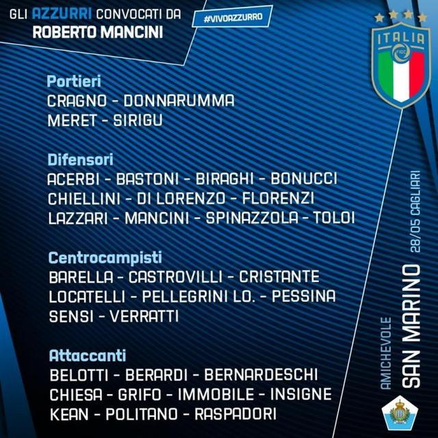 JRS直播网讯北京时间5月18日,意大利足协官方公布欧洲杯33人初选名单,尤文老将基耶利尼领衔,罗马尼奥利落选。