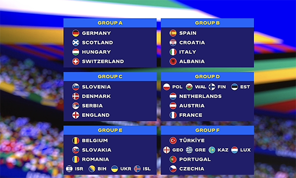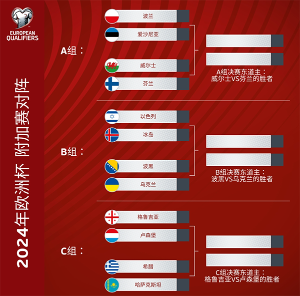 按照规则,德国作为东道主落位A1,抽签除了同档回避,没有任何限制。3个名额将由12支球队通过附加赛决出,具体是:A组的波兰vs爱沙尼亚、威尔士vs芬兰,B组的以色列vs冰岛、波黑vs乌克兰,C组的格鲁吉亚vs卢森堡、希腊vs哈萨克斯坦。
