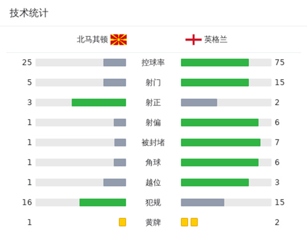 双方出场阵容: 北马其顿首发:1-迪米特列夫斯基、15-马内夫、4-谢拉菲莫夫、6-穆斯柳、14-迪莫斯基(86’3-阿什科夫斯基)、8-阿里奥斯基、10-巴尔迪、21-阿塔纳索夫(91’17-埃莱齐)、18-阿利米(75’16-科斯塔迪诺夫)、7-埃尔马斯、9-米奥夫斯基(75’19-里斯托夫斯基) 替补未出场:12-阿列克索夫斯基、22-希什科夫斯基、2-伊利亚佐夫斯基、5-阿德米、11-丘尔利诺夫、13-米特罗夫斯基、20-达奇、23-托多罗斯基 英格兰首发:1-皮克福德、2-沃克、3-里科-刘易斯、5-格伊、6-马奎尔、4-赖斯、10-阿诺德(84’15-菲利普斯)、11-格拉利什(84’18-拉什福德)、7-萨卡(84’19-帕尔默)、8-福登、9-沃特金斯(58’20-凯恩) 替补未出场:13-约翰斯通、22-拉姆斯代尔、12-托莫里、14-亨德森、16-加拉格尔、17-孔萨