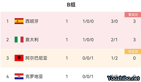 同时死亡之组的最新排名更新,首战3-0 横扫克罗地亚的西班牙队排名第一,意大利队第二,阿尔巴尼亚排名第三,世界杯季军得主的克罗地亚队,排名垫底,出乎不少人的意料。