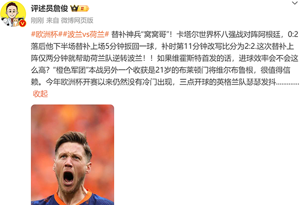 这场比赛期间,荷兰队不断浪费机会,包括德佩、西蒙斯等人,场边的荷兰主帅科曼非常着急,他被拍摄到疑似流鼻血,随后又放在嘴里舔了一口,这样的局面,确实让科曼很着急。终于科曼上演神奇的换人,替补上场的韦霍斯特破门得分,仅仅用了2分钟的时间,创造荷兰队在欧洲杯替补上场时间进球最快的纪录。