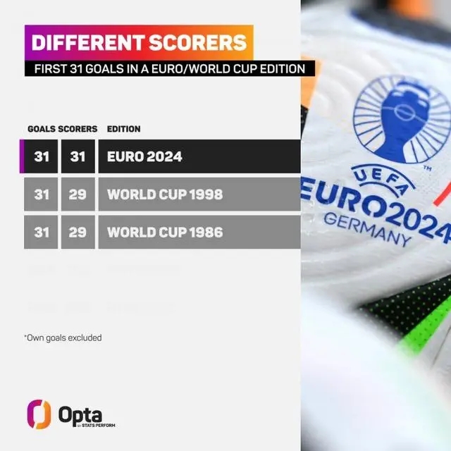 JRS直播网讯 据Opta统计,乌龙球除外,这是国际大赛历史上(欧洲杯/世界杯)首次赛事前31粒进球由31名不同的球员打进。