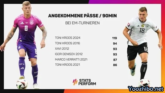 JRS直播网讯 根据统计,现年34岁的托尼-克罗斯本届欧洲杯小组赛前两轮平均每90分钟能够为队友送出119脚传球,在欧洲杯历史上所有出场至少150分钟的中场球员里,这样的数据排名第一。