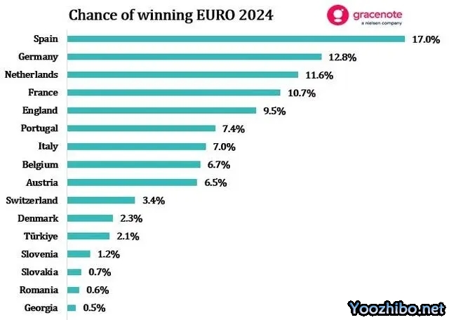 JRS直播网讯 6月27日讯 欧洲杯小组赛全部战罢,16强对阵出炉。数据机构Gracenote给出了各队夺冠概率,西班牙17.0%举手,德国12.8%次之。