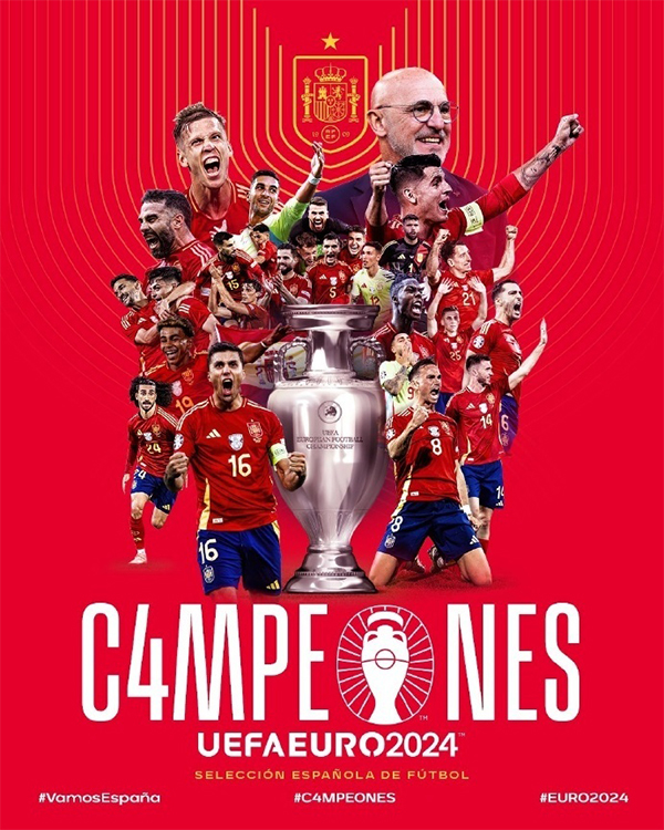 冠军由西班牙队夺得,在决赛中,西班牙2-1绝杀英格兰,队史第4次捧起欧洲杯冠军奖杯,也借此超越德国,成为欧洲杯夺冠次数最多的国家。