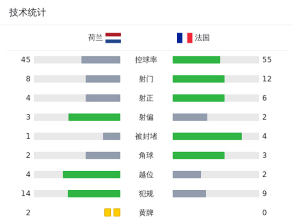 双方出场阵容: 荷兰首发:1-维尔布鲁根、2-吉尔特鲁伊达、4-范迪克、5-阿克(80' 3-范德文)、22-邓弗里斯(62' 21-弗林蓬)、15-德容恩、16-维尔曼、12-哈特曼、14-赖因德斯、10-哈维-西蒙斯(80' 7-贝尔温)、9-韦霍斯特(38' 18-马伦) 荷兰替补:13-奥利杰、23-诺珀特、6-德弗里、8-维弗尔、11-斯滕斯、17-布林德、19-布罗比、20-马特森 法国首发:16-迈尼昂、22-特奥、21-卢卡斯、13-科纳特、3-克劳斯(80' 4-古斯托)、8-琼阿梅尼、7-格列兹曼(87' 18-福法纳)、14-拉比奥特、20-科曼(71' 9-吉鲁)、10-姆巴佩、12-穆阿尼(80' 15-图拉姆) 法国替补:1-桑巴、23-阿雷奥拉、2-帕瓦尔、5-卢克巴、6-卡马文加、11-登贝莱、17-托迪博、19-卡马拉
