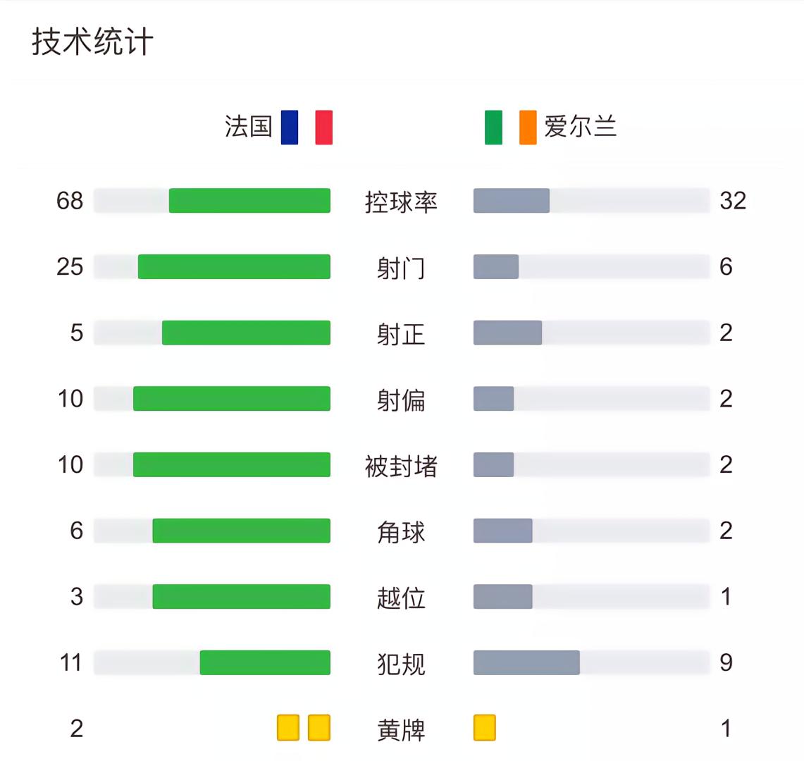 双方出场阵容: 法国出场阵容:16-迈尼昂、4-于帕梅卡诺、21-卢卡斯-埃尔南德斯(72’17-萨利巴)、5-孔德(88’2-帕瓦尔)、22-特奥-埃尔南德斯、14-拉比奥特、8-琼阿梅尼、7-格列兹曼(89’6-卡马文加)、11-登贝莱(72’20-科曼)、10-姆巴佩、9-吉鲁(26’15-图拉姆) 替补未出场:1-桑巴、23-阿雷奥拉、3-迪萨西、12-穆阿尼、13-托迪博、18-尤素夫-福法纳、19-卡马拉 爱尔兰出场阵容:1-巴祖努、5-伊根、12-柯林斯、3-斯蒂文斯(45’11-麦克莱恩)、14-莫伦比(67’2-奥谢)、6-库伦、8-布朗、4-达菲、20-奥贝恩(83’21-恩波塞勒)、9-伊达赫(67’10-基恩(78’15-康纳利))、17-杰森-奈特 替补未出场:16-凯莱赫、23-特拉弗斯、7-斯莫本恩、13-亨德里克、18-麦克格拉斯、19-勒尼汉、22-曼宁