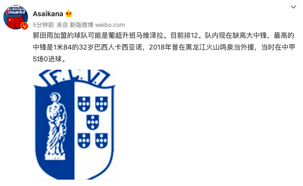 JRS直播网01月27日讯 据《体坛周报》记者王晓瑞、媒体人白国华等消息源报道,郭田雨将在下个月租借加盟葡超球队维泽拉,租期半年。