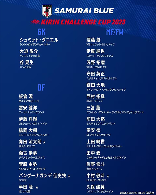 中前场:远藤航、伊东纯也、浅野拓磨、守田英正、镰田大地、西野拓真、三笘薫、前田大然、堂安律、上田绮世、田中碧、町野修斗、中村敬斗、久保建英