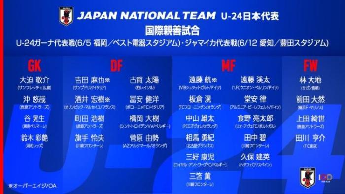 JRS直播网讯 今天,日本足协公布了新一期的国奥队大名单,吉田麻也、酒井宏树和远藤航将作为超龄球员参加东京奥运会。