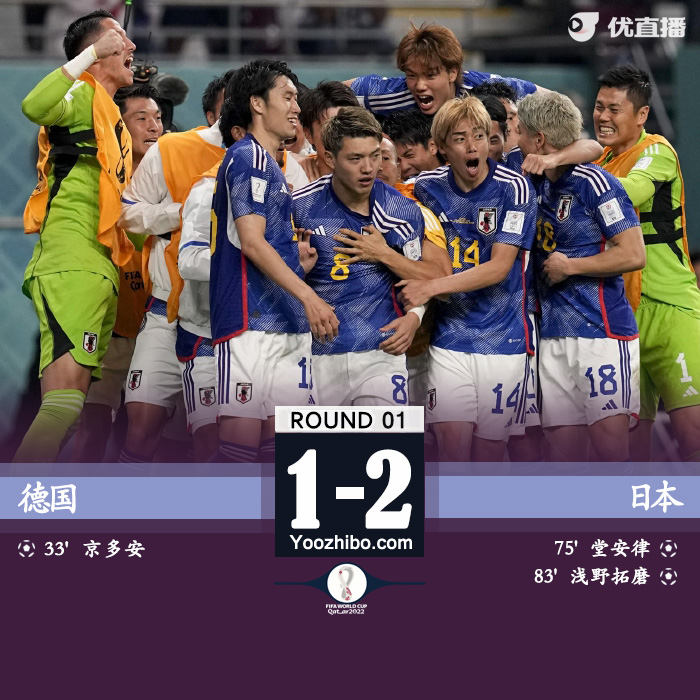 JRS直播网讯 北京时间11月23日晚上21:00,世界杯E组首轮,德国对阵日本。上半场,劳姆造点京多安主罚命中。下半场,格纳布里中框,京多安中柱,权田修一屡献神扑,酒井宏树失空门,替补登场的堂安律和浅野拓磨先后破门逆转比分。全场结束,德国1-2日本爆出大冷门。