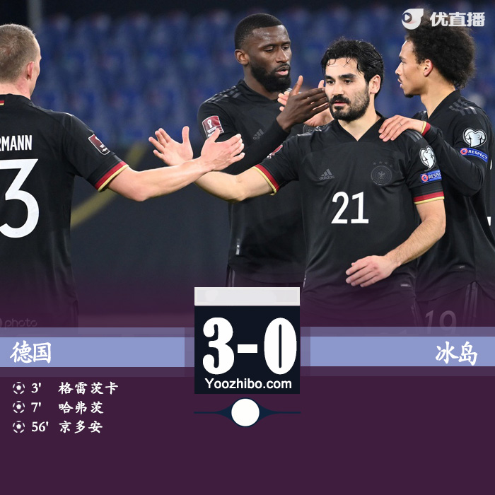 JRS直播网3月26日讯 北京时间3月25日,世预赛欧洲区预选赛J组第一轮,德国主场迎战冰岛。上半时一开场,格纳布里助攻格雷茨卡破门,随后萨内助攻哈弗茨进球,吕迪格失良机。下半时京多安远射破门,格纳布里中柱,哈弗茨越位进球无效,穆西亚拉替补登场完成首秀。最终,德国3-0战胜冰岛,德国队取得开门红。