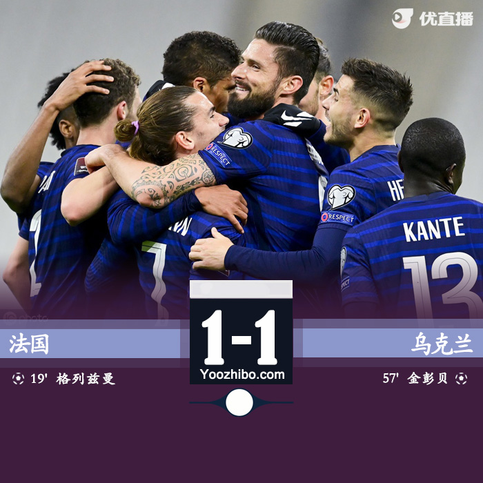 JRS直播网3月25日讯 北京时间3月25日03:45,世界杯欧洲区预选赛D组首轮展开争夺,法国迎战乌克兰。上半场,格列兹曼世界波帮法国取得领先。下半场,西多丘克射门造成金彭贝乌龙帮乌克兰扳平比分。最终,法国1-1打平乌克兰,两队各取1分。