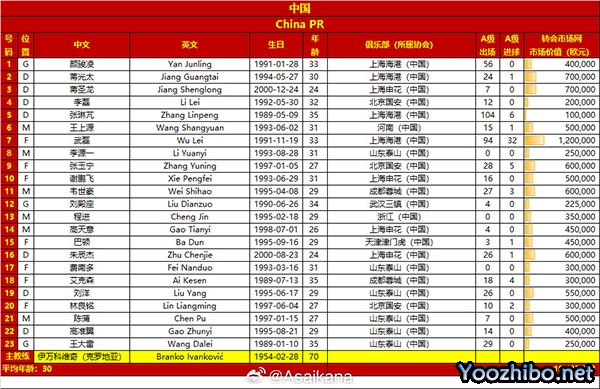 附:国足对阵新加坡23人参赛名单及号码